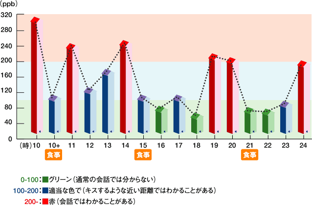 | 少しのリラックスと食事で口臭値が低下。 | |