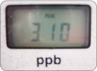 AM10:00 寝起きでタバコを一服。 右写真:いつもの習慣で、寝起きでタバコを一服、その後の記念すべき第一回測定値。310という予想以上の強い口臭値という結果に。300を超えると最も口臭が強いと言われていますので、寝起きは要注意ですね。 |